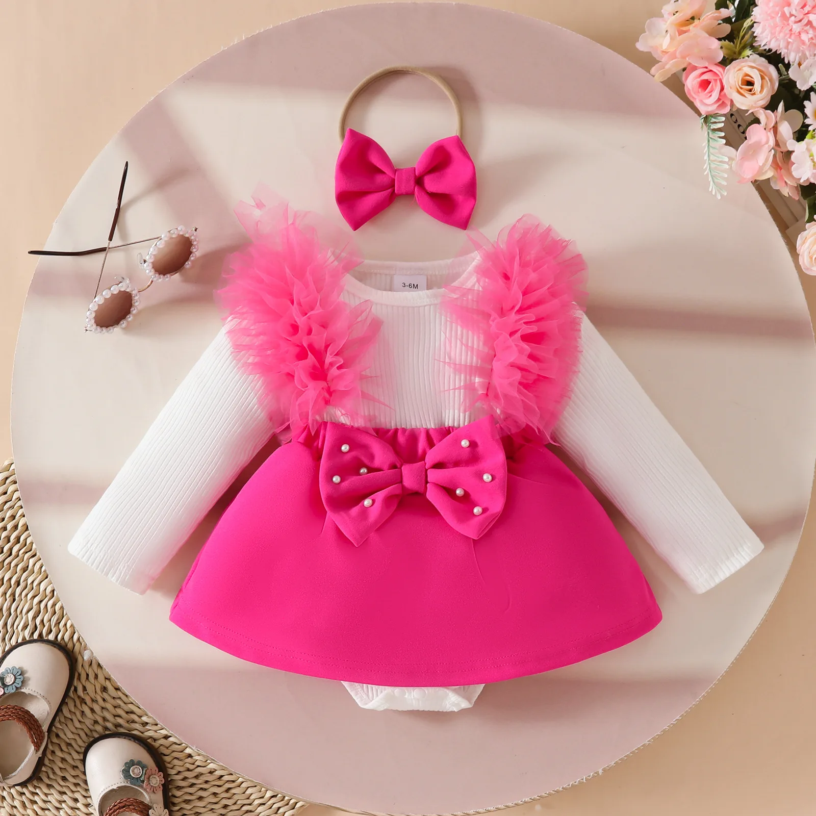 Kaiyue Sweet Autumn Long Sleeves Girls Bow Romper Dress 0-18 Months Baby Bead With Hair Band Girls Clothes Set