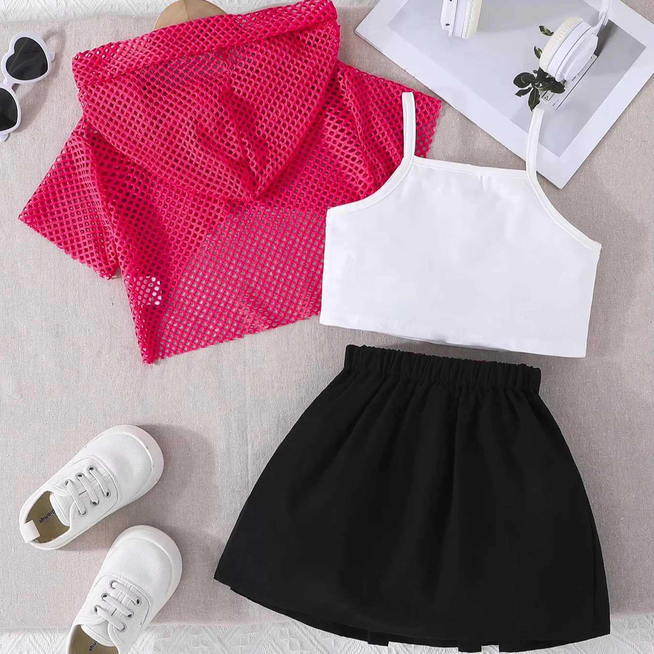 Kids Clothing Teenage Girls Clothing Grid Hooded Sweatshirt and Minimalist Vest Fashion Pleated Skirt Girl’s Skirt Set-3pcs