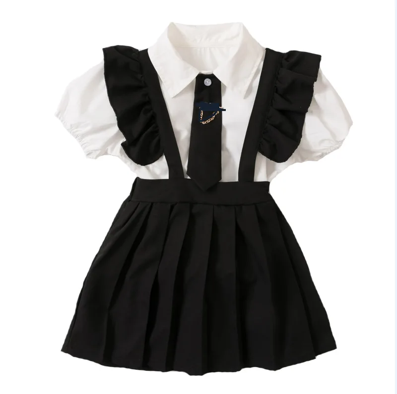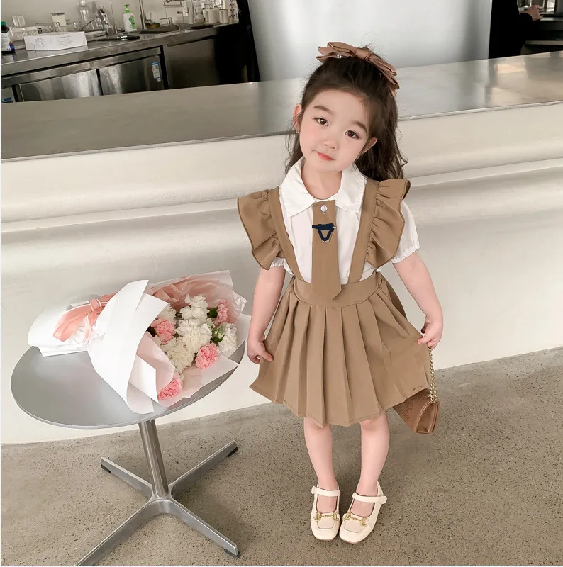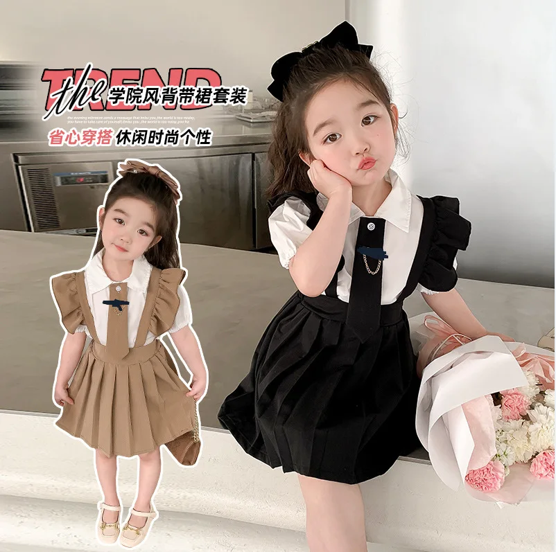 Korean Summer Girl Clothes Set Kids Summer T Shirt Suspender Dress Two Piece Clothing Sets Casual Girl Suit