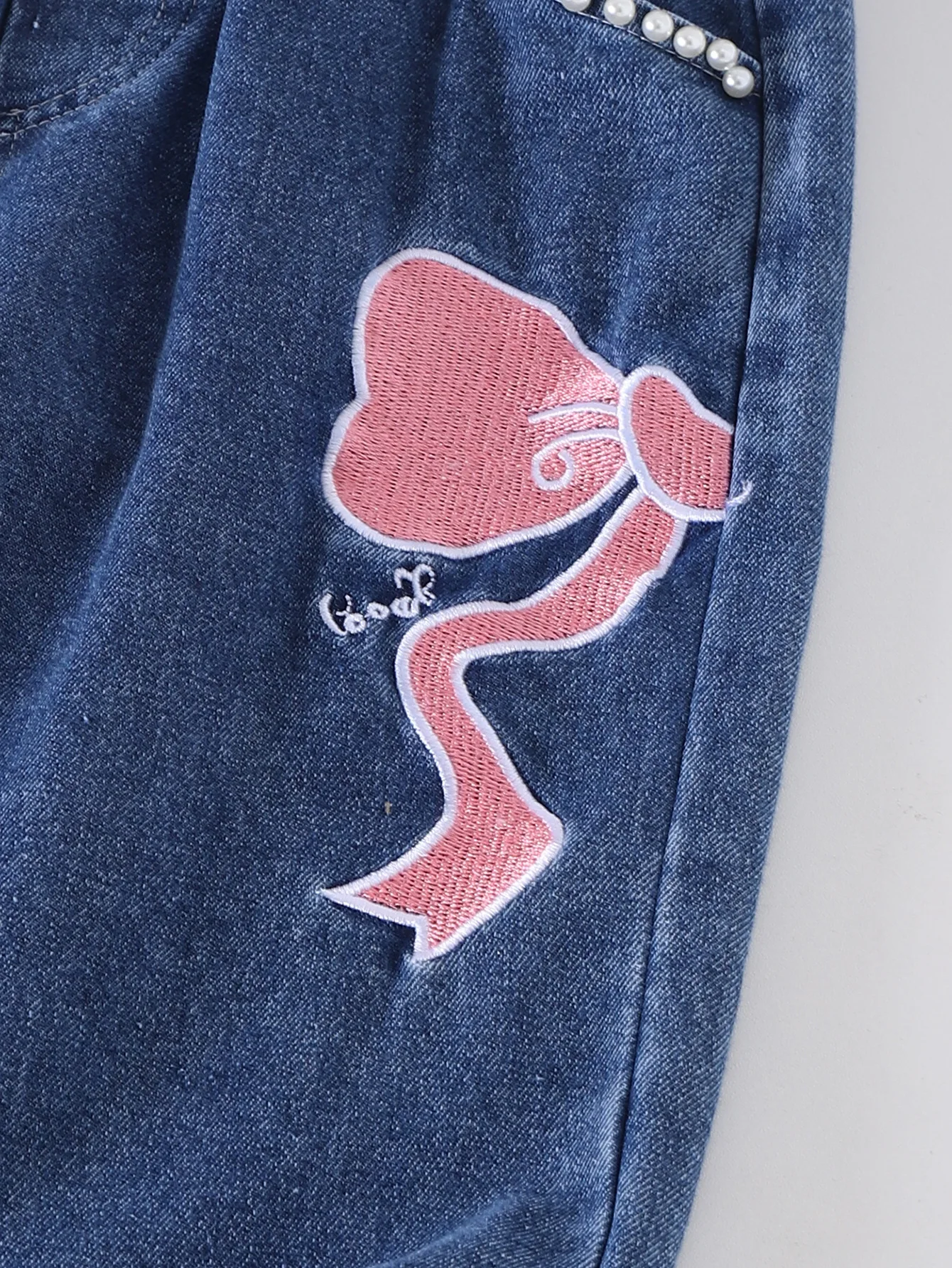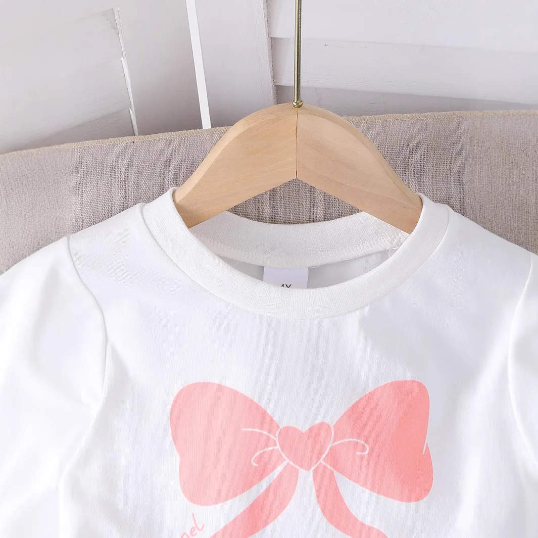 New Children Girl Summer Short Set White Shirt With Bows Print + Pearls Matching Denim Pants 2 Pcs Set