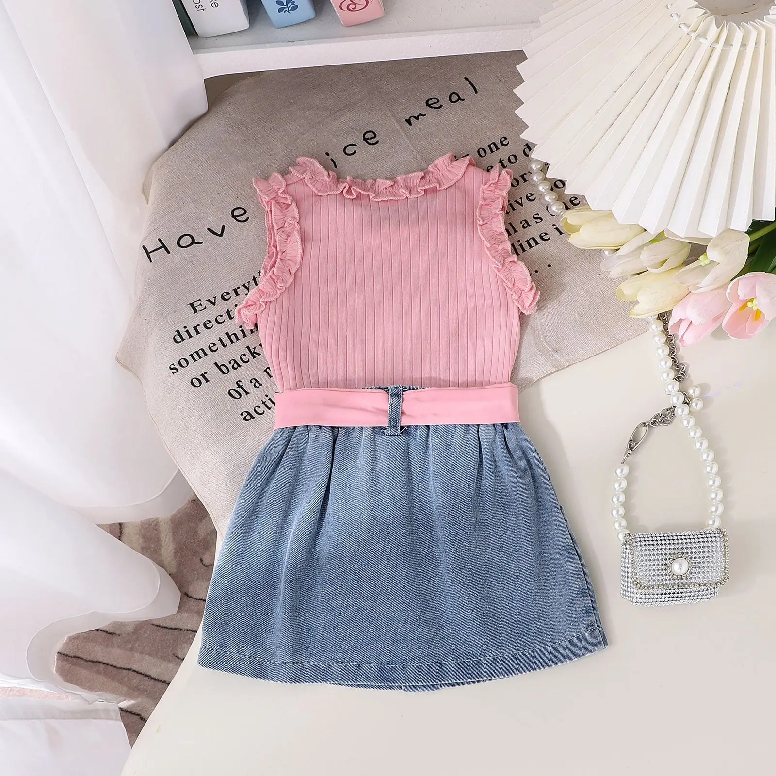 Summer Girl Clothing Set Solid Color Cotton Vest With Lace Pit and Denim Skirt Cross-Border Foreign Trade New Model