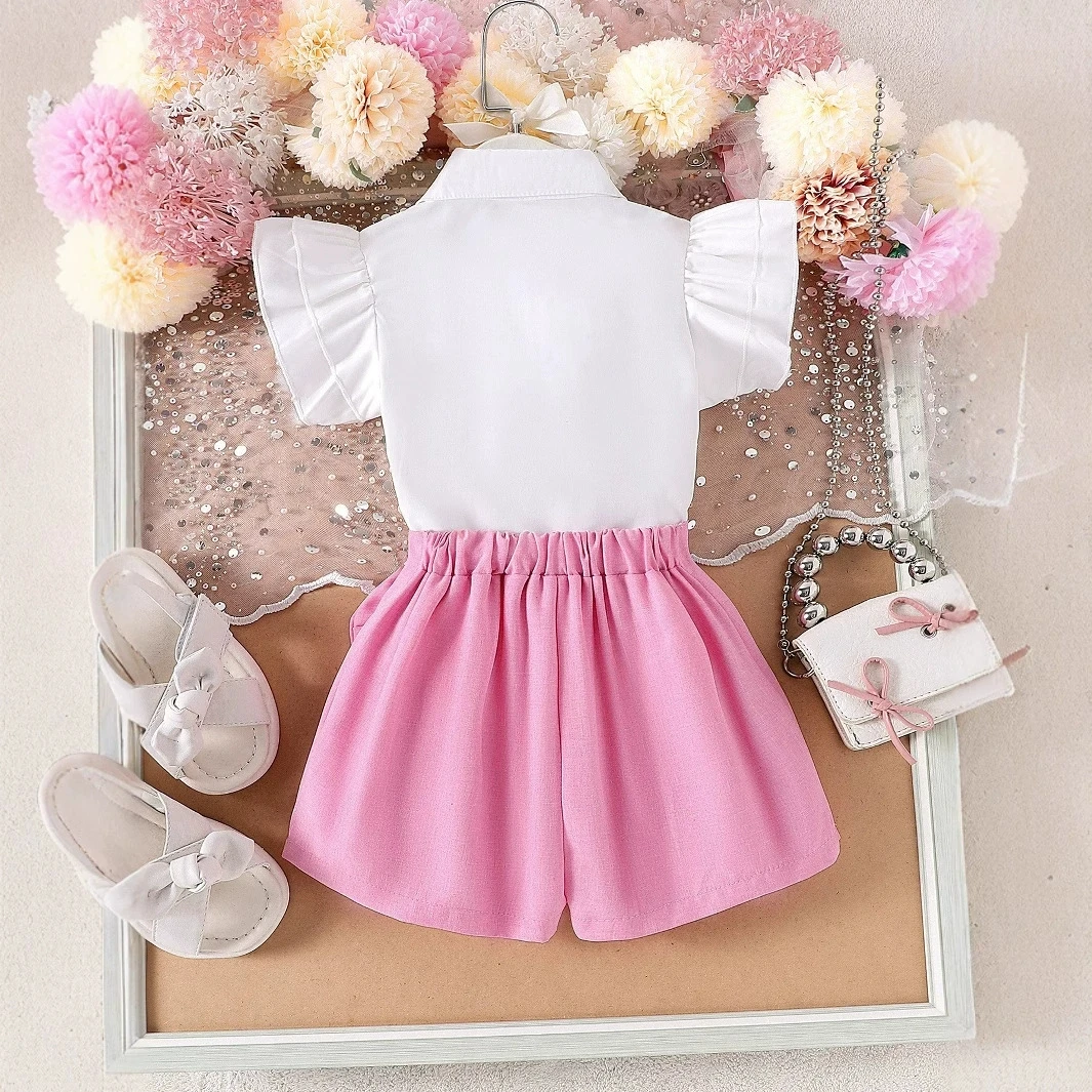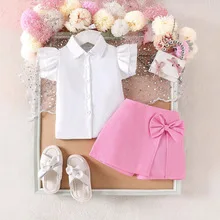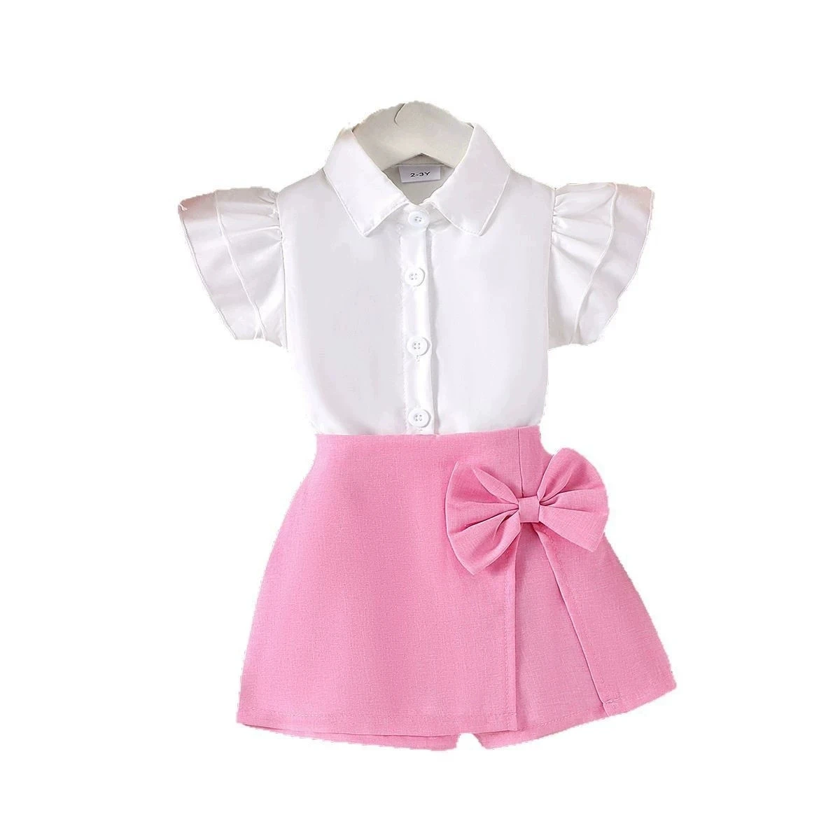 Summer Girls Clothing Sets 4-7 Years Kids White Blouse With Pink Bow Skirt Two Piece Set