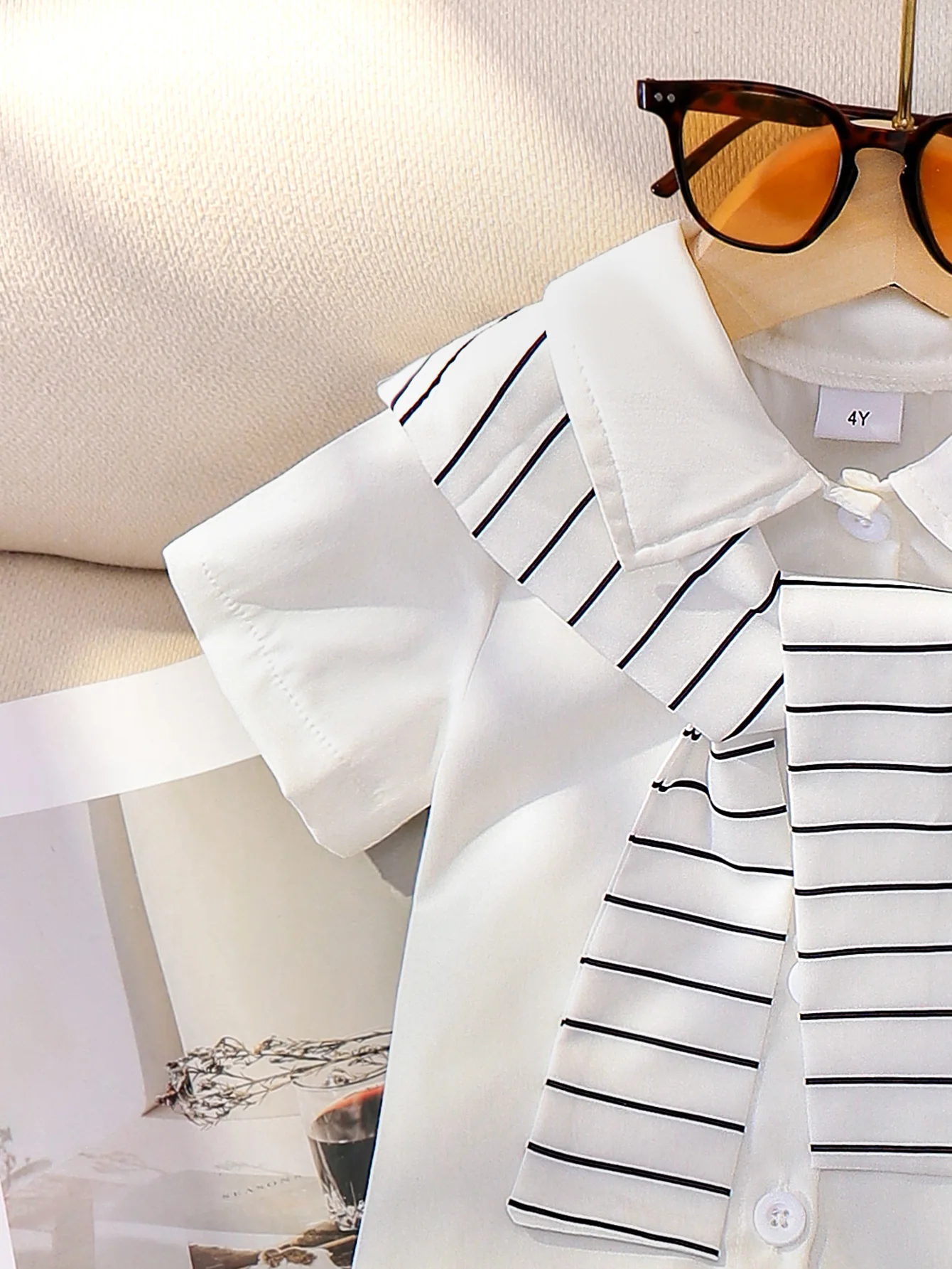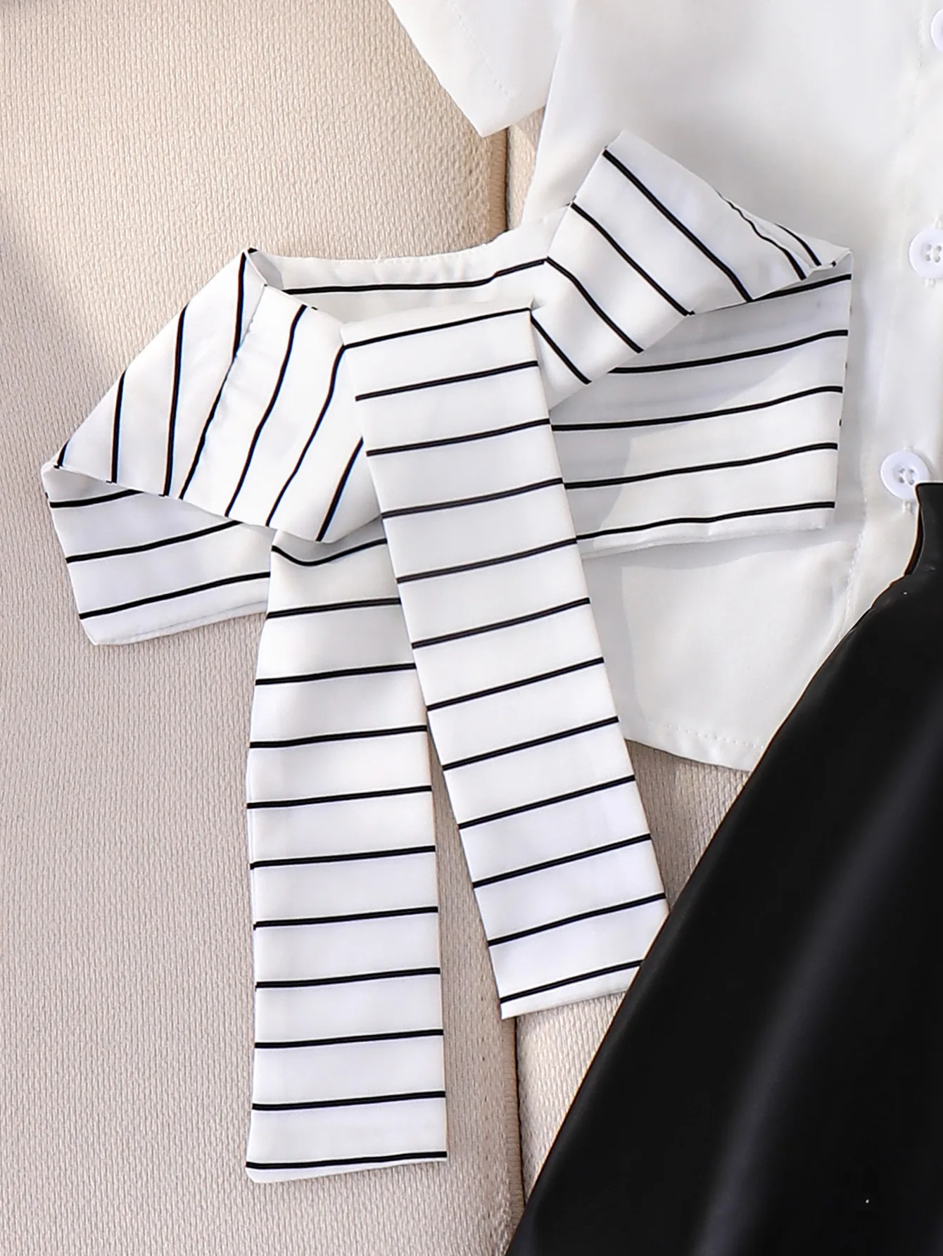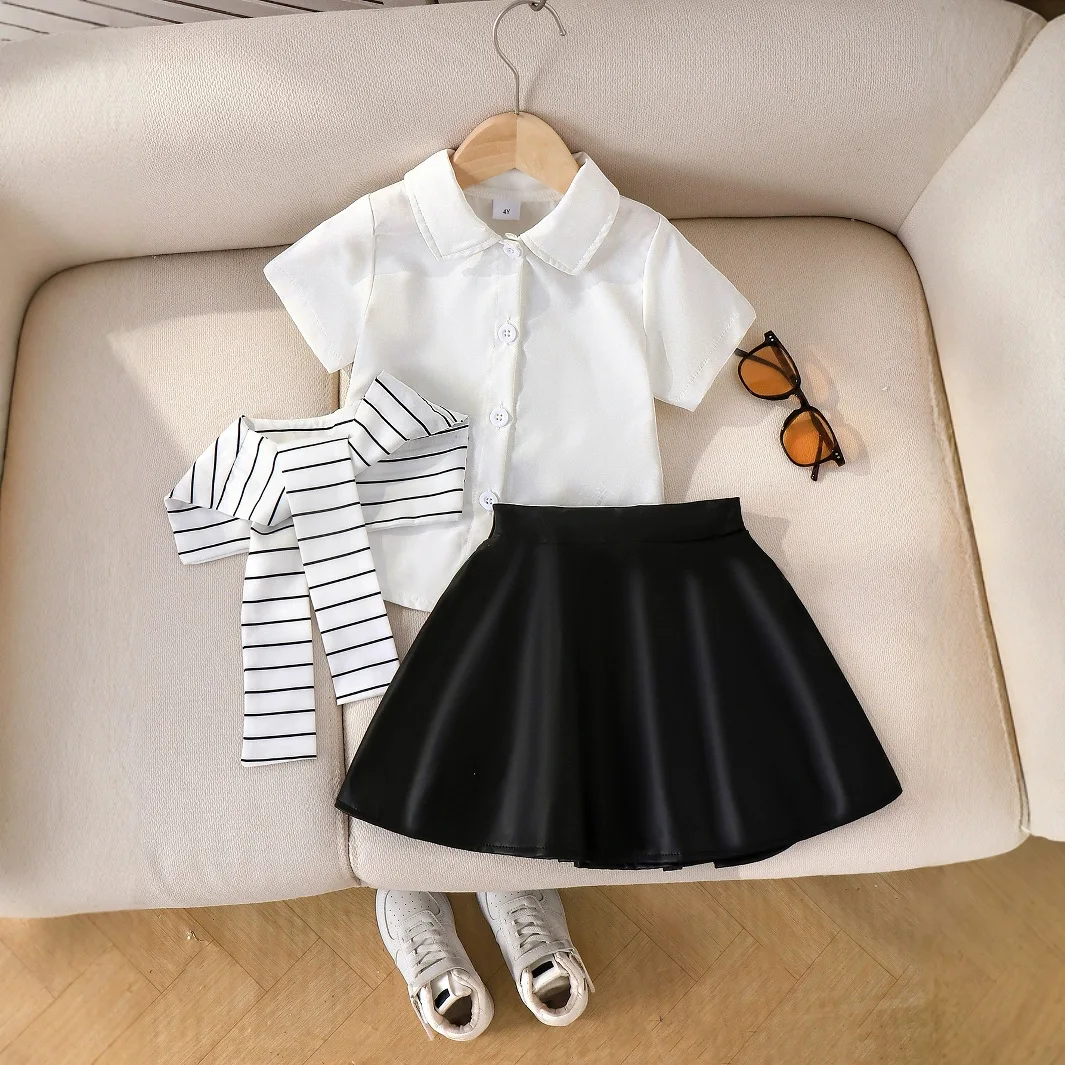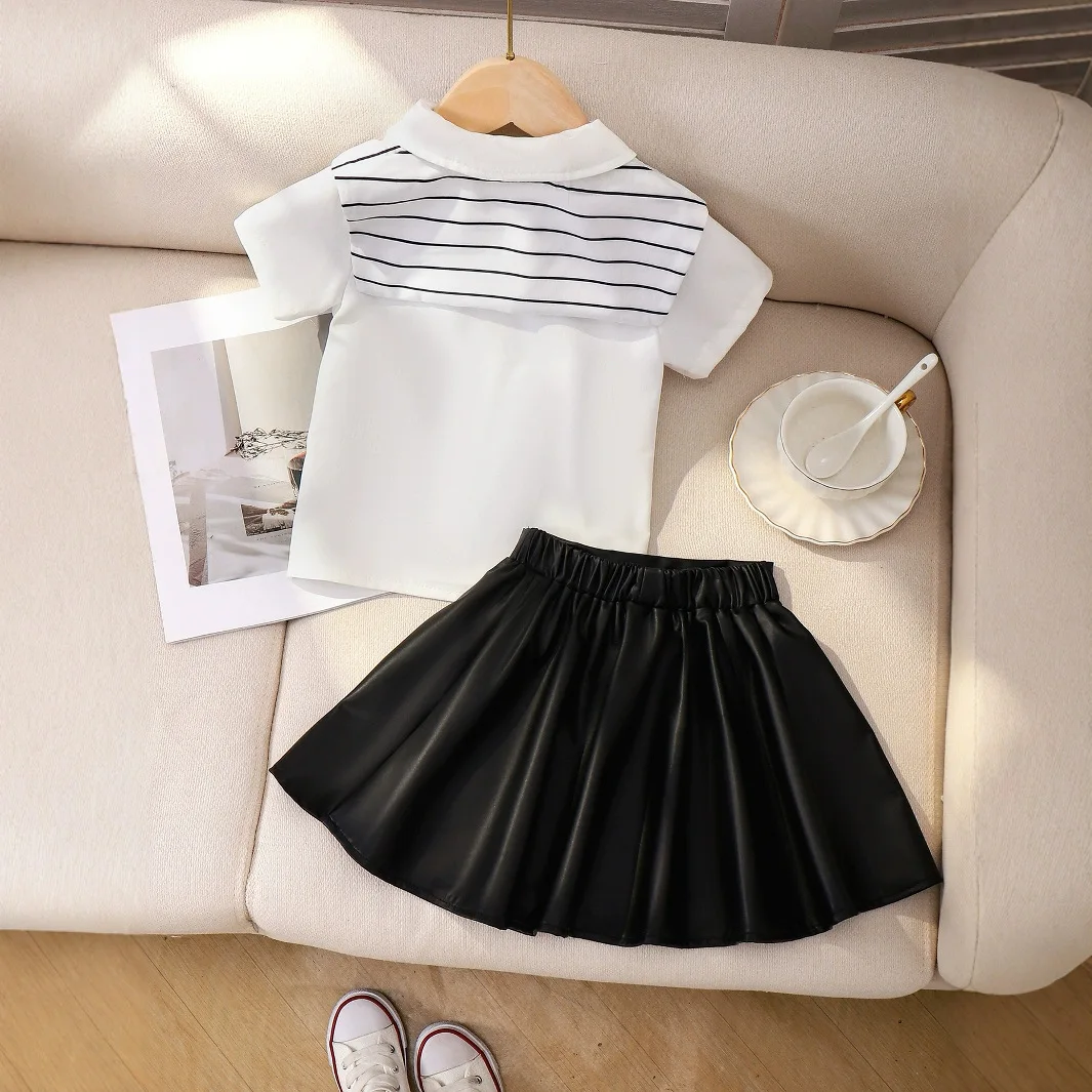 Summer New Girls Academic Style Striped Shawl Flip Collar Shirt With Solid Color Skirt Two-Piece